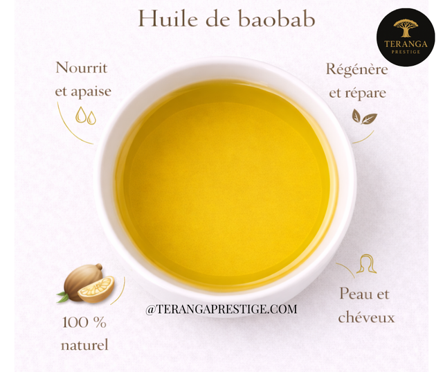 L’huile de baobab est une huile végétale naturelle extraite des graines du fruit du baobab, arbre emblématique d’Afrique. Appréciée pour sa texture légère et pénétrante, elle est traditionnellement utilisée dans les soins de la peau et des cheveux pour nourrir, assouplir et protéger.