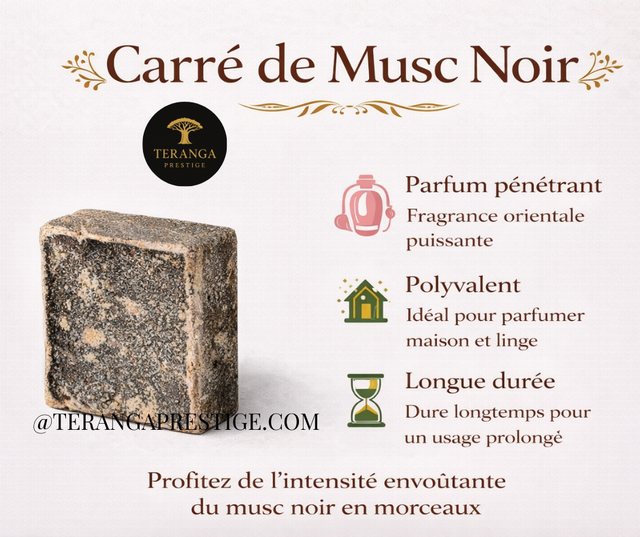 Chez Teranga Prestige, le musc noir solide est soigneusement sélectionné pour garantir sa qualité son authenticité, sa concentration élevée et sa longue tenue. Son parfum profond et enveloppant convient aussi bien aux femmes qu’aux hommes, et peut être porté seul ou combiné à d’autres fragrances pour créer une signature unique.
