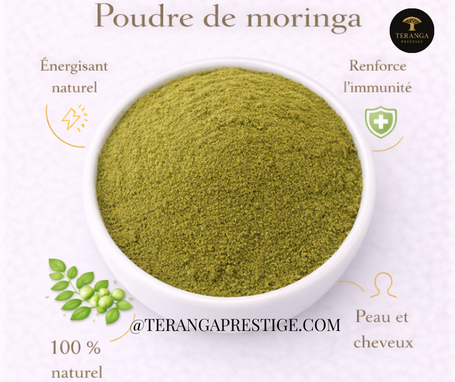 Chez Teranga Prestige, la poudre de moringa est sélectionnée avec rigueur afin de garantir une qualité 100% naturelle, sans additifs, conservateurs ni agents chimiques. Les feuilles sont séchées selon des méthodes traditionnelles puis réduites en poudre fine pour assurer une excellente conservation et une utilisation optimale.