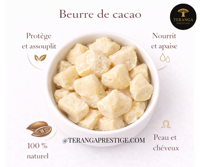 Le beurre de cacao est un beurre végétal naturel extrait des fèves de cacao. Utilisé depuis des générations dans les soins corporels et capillaires, il est apprécié pour sa texture riche, fondante et son parfum naturellement gourmand. Il occupe une place importante dans les routines de soin traditionnelles grâce à ses propriétés nourrissantes et protectrices.