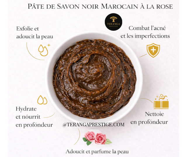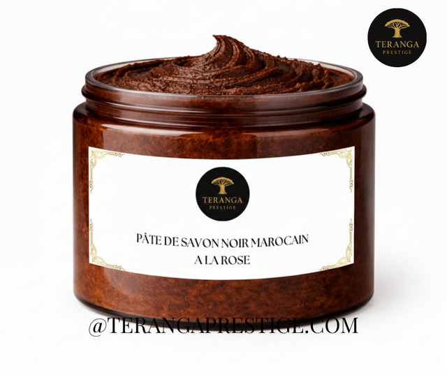 Chez Teranga Prestige, la pâte de savon noir marocain à la rose est fabriqué traditionnellement, avec rigueur afin de garantir un produit authentique, sans additifs chimiques ni agents artificiels.