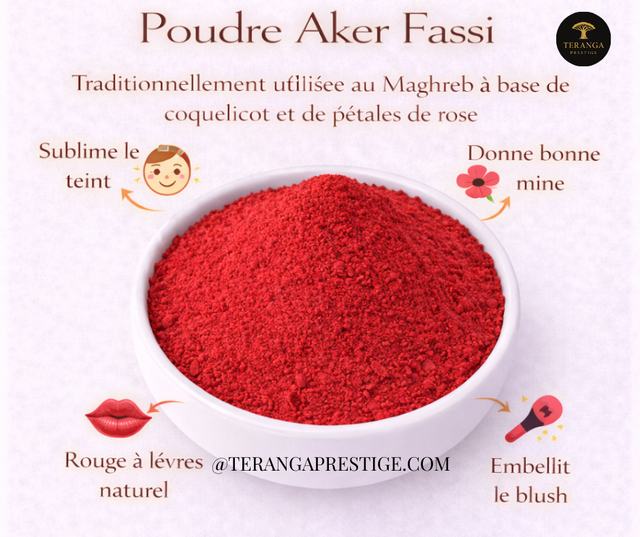 La poudre d’aker fassi est une poudre traditionnelle emblématique des rituels de beauté nord africains, reconnue pour sa couleur rouge rosée intense et son usage ancestral dans les soins de la peau. Obtenue à partir de pétales de coquelicot séchés et de pelures de grenade, elle est utilisée depuis des générations pour sublimer l’apparence de la peau.